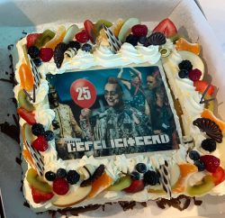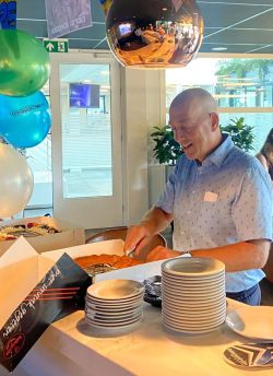 Collegaโ€™s en familie hebben zich verzameld voor een taartje, drankje en een bitterballetje om te proosten. Namens alle collegaโ€™s: gefeliciteerd met je zilveren jubileum!